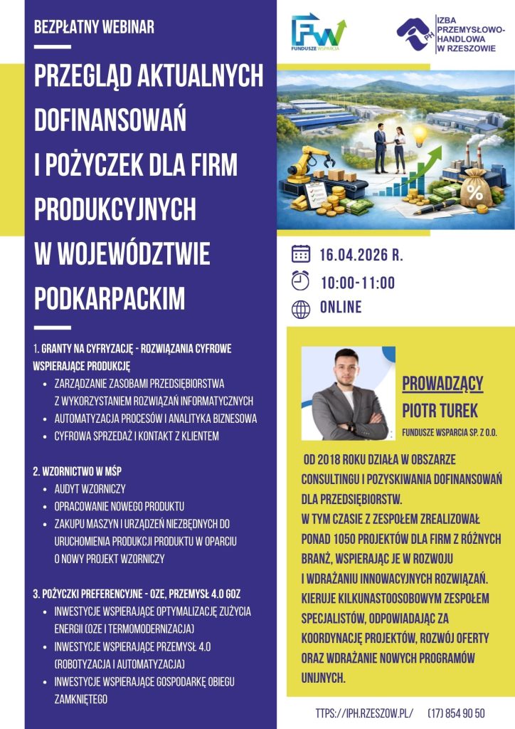ZAPISZ SIĘ NA webinar:Udział jest bezpłatny. Nazwa firmy Miejscowość, kod pocztowy NIP Imię i nazwisko uczestnika Stanowisko uczestnika Adres e-mail Telefon „Wyrażam zgodę na przetwarzanie moich danych osobowych” * KLAUZULA INFORMACYJNA Aby otrzymać link do webinaru, konieczna jest rejestracja poprzez powyższy formularzW razie pytań zapraszamy do kontaktu:tel. 17 854-90-50, email szkolenia@iph.rzeszow.pl